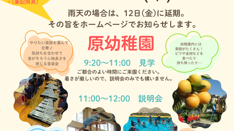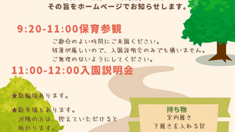 令和8年度新入園児のための入園説明会を行います。 9月11日(木)11:00~12:00 その前に見学もしていただけますが、暑さが厳しいため、ご無理のないようにしてください。 見学はいつでもできますので、暑さが多...