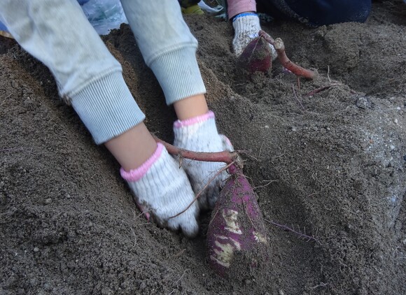 2024年11月28日(木) 日々の出来事 < お知らせ 芋掘り 11月は、芋掘りにも行きました。 サツマイモの葉が広がる芋畑に着くと、先生たちが鎌でつるを切る様子を「がんばれ!がんばれ!」と応援。 そこから、軍手をはめた手で、お芋の周りをひたすら掘る、掘る、掘る。 皮にあたって、少々傷つけてしまうのは、ご愛敬ということで...^^ お芋が出でくると「先生、見て~♪」と大満足。 自分で掘ったサツマイモは、きっとうんと美味しかったことでしょう。