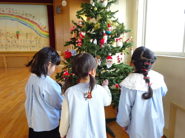 2025年01月17日(金) 日々の出来事 < お知らせ クリスマス会 12月20日(金)クリスマス会。 その朝の空を見上げて 「わ~‼白い線がいっぱい!」 「サンタさんかな」 「あっちにもビュ~ンってあるよ」 と想像と期待を膨らませる子どもたち。 クリスマスの劇を見た後は、 全員、プレゼントをもらって、 友だちと顔を見合わせてにっこり笑顔でした♪