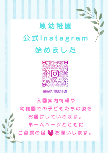 2025年09月12日(金) 日々の出来事 < お知らせ Instagram始めました♫ 原幼稚園も、Instagramを始めました! 今までホームページ「お知らせ」に記載していた内容などを、お届けしていきます。 ぜひご覧ください。