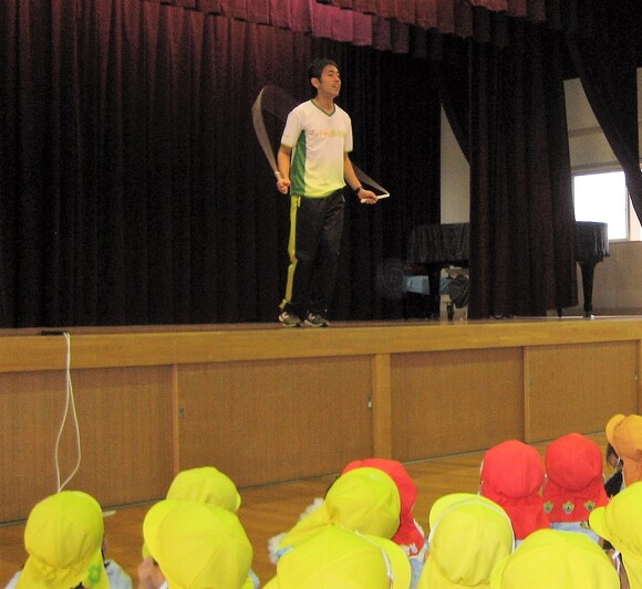 2016年11月21日(月) 日々の出来事 < お知らせ 縄跳び教室 11月14日(月)の縄跳び教室。 講師は「TEAMパフォーマンス ラボ」の粕尾将一先生。 『シルク・ドゥ・ソレイユ』に在籍されていた、 縄跳びのプロパフォーマー“まっちゃん”の様々な技に、みんな釘付け‼ ハヤブサや三重跳び・・・六重跳びにびっくり!! 技を見せていただいた後は、子どもたちも縄を持って実践、 持ち方や跳び方のコツをわかりやすく教えていただきました。 プロの技が刺激となり、体を動かす楽しさも伝わって、 縄跳びで遊ぶ子どもがどんどん増えています。
