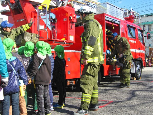 2017年03月03日(金) 日々の出来事 < お知らせ 天白消防署見学 2月7日(火)、年長児さんが天白消防署に見学に行きました。 はしご車や救急車についての説明を聞いたり、運転席に乗せてもらったりしました。 「消防士さんの制服を着ることができて嬉しかった!」と喜んだり、 救助までの出動の様子を見せていただき、その素早さに驚いたり・・・ 終始 目を輝かせていました。