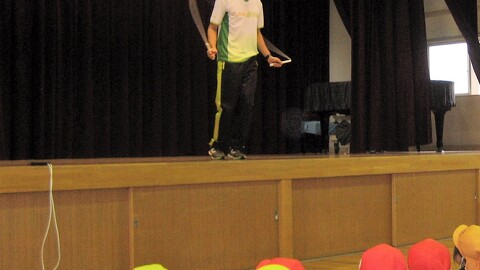 11月14日(月)の縄跳び教室。 講師は「TEAMパフォーマンス ラボ」の粕尾将一先生。 『シルク・ドゥ・ソレイユ』に在籍されていた、 縄跳びのプロパフォーマー“まっちゃん”の様々な技に、みんな釘付け‼ 技を見...