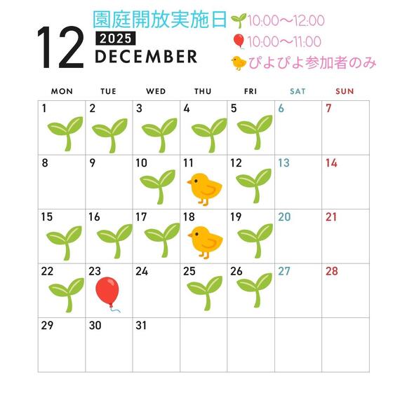 2025年12月02日(火) お知らせ 12月の園庭開放 12月の園庭開放(10:00〜12:00)について、お知らせします。 上記のカレンダーでご確認ください。 予約は不要ですので、お気軽にお立ち寄りくださいね。