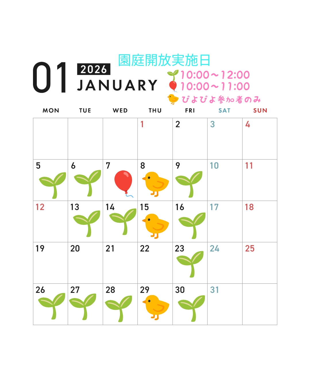 2026年01月13日(火) お知らせ 1月の園庭開放 ご案内が遅くなりましたが… 1月の園庭開放(10:00〜12:00)についてお知らせします。 上記のカレンダーでご確認ください。 予約は不要ですので、お気軽にお立ち寄りくださいね。