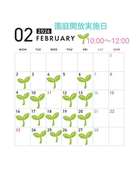 2026年01月30日(金) お知らせ 2月の園庭開放 2月の園庭開放(10:00〜12:00)についてお知らせします。 上記カレンダーでご確認ください。 晴れた日は、原幼稚園の暖かい園庭に遊びに来てくださいね。 予約は不要です。