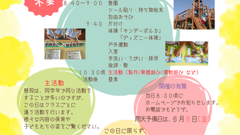6月の園庭開放についてお知らせします。 ★実施日★ 2(月) 3(火)4(水) 9(月)10(火)13(金) 16(月)17(火)18(水)20(金) 23(月)24(火)25(水)27(金) 30(月) ★ぴよぴよ参加者のみ★ 12(木)19(木)26(木) 予約は不要ですの...